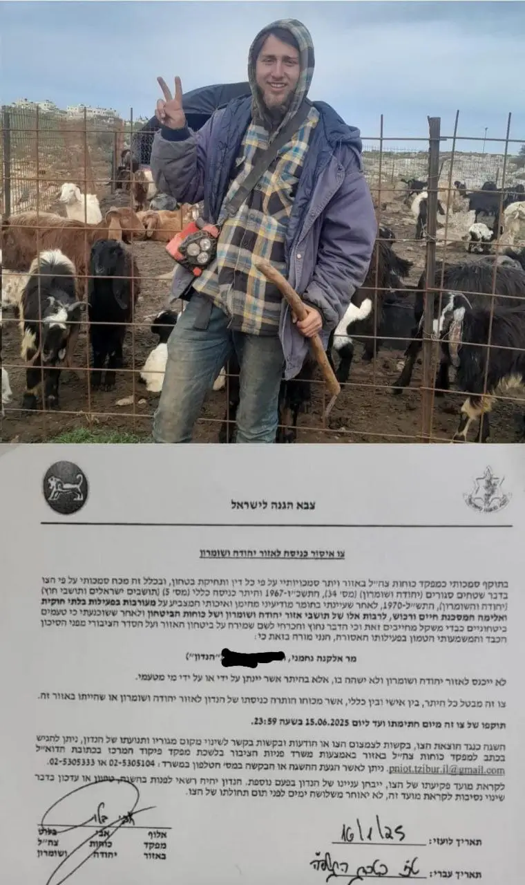 בלשי ימ"ר ש"י מסרו היום צו מנהלי חריג עם שורת הגבלות בחתימתו של אלוף פיקוד המרכז אבי בלוט, לאלקנה נחמני רועה צאן מגבעת אור מאיר בבנימין הסמוכה לעפרה.